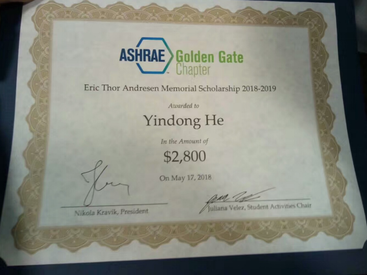 2018年5月17日,美国采暖、制冷与空调工程师学会(American Society of Heating Refrigerating and Air-Conditioning Engineer)金门大桥奖(ASHRAE-Golden Gate Scholarship)颁奖仪式在美国旧金山举办。土木学院2014级直博生何颖东凭借以“Usage, Models and Effects of Personal Comfort Systems in Buildings”为主题的研究获得美国采暖、制冷与空调工程师学会金门大桥奖,同时也是所有获奖人员中仅有的两位中国学生之一。