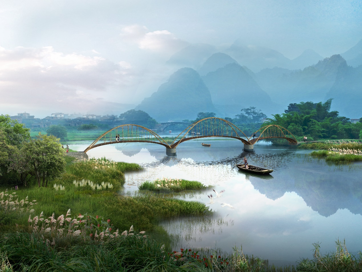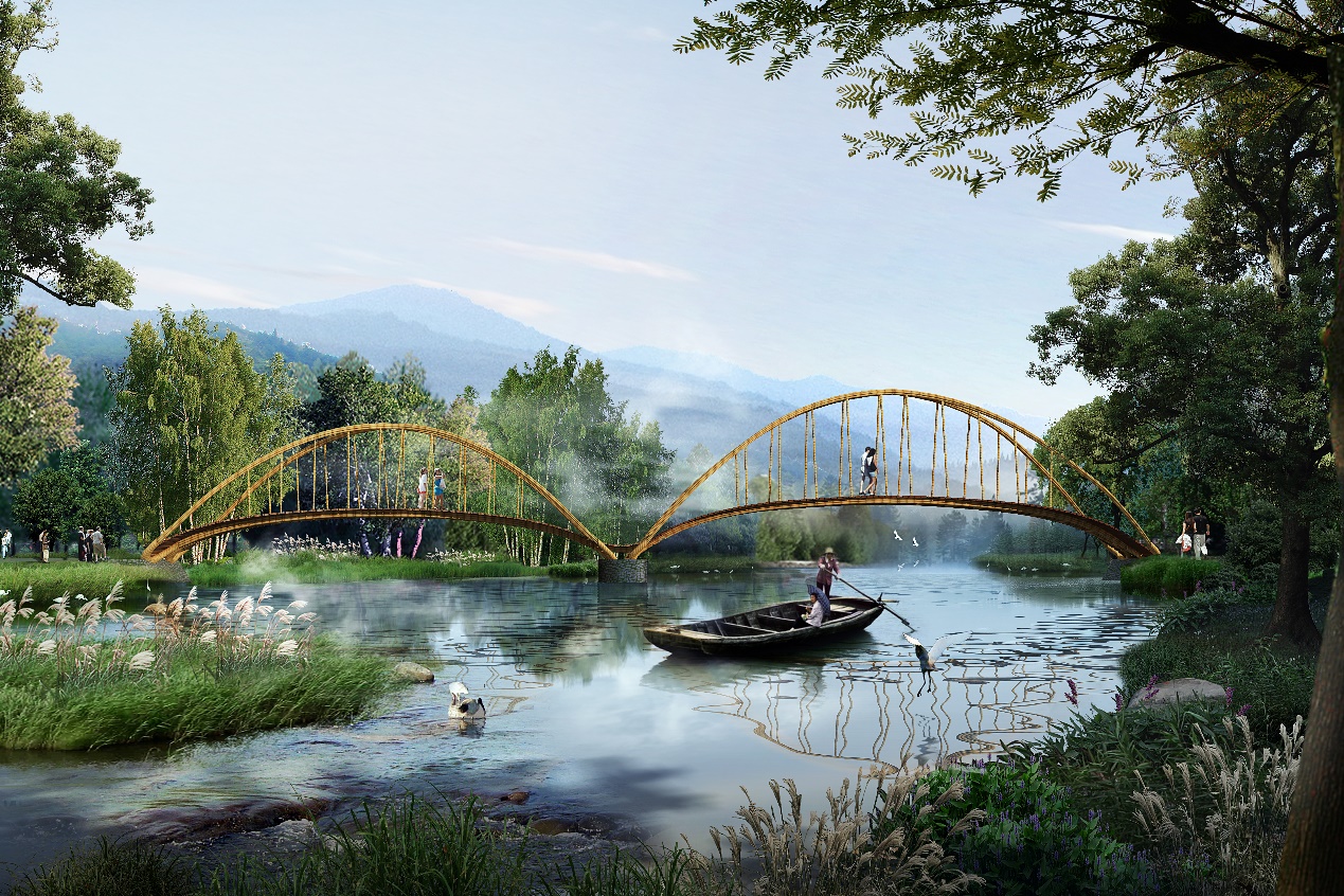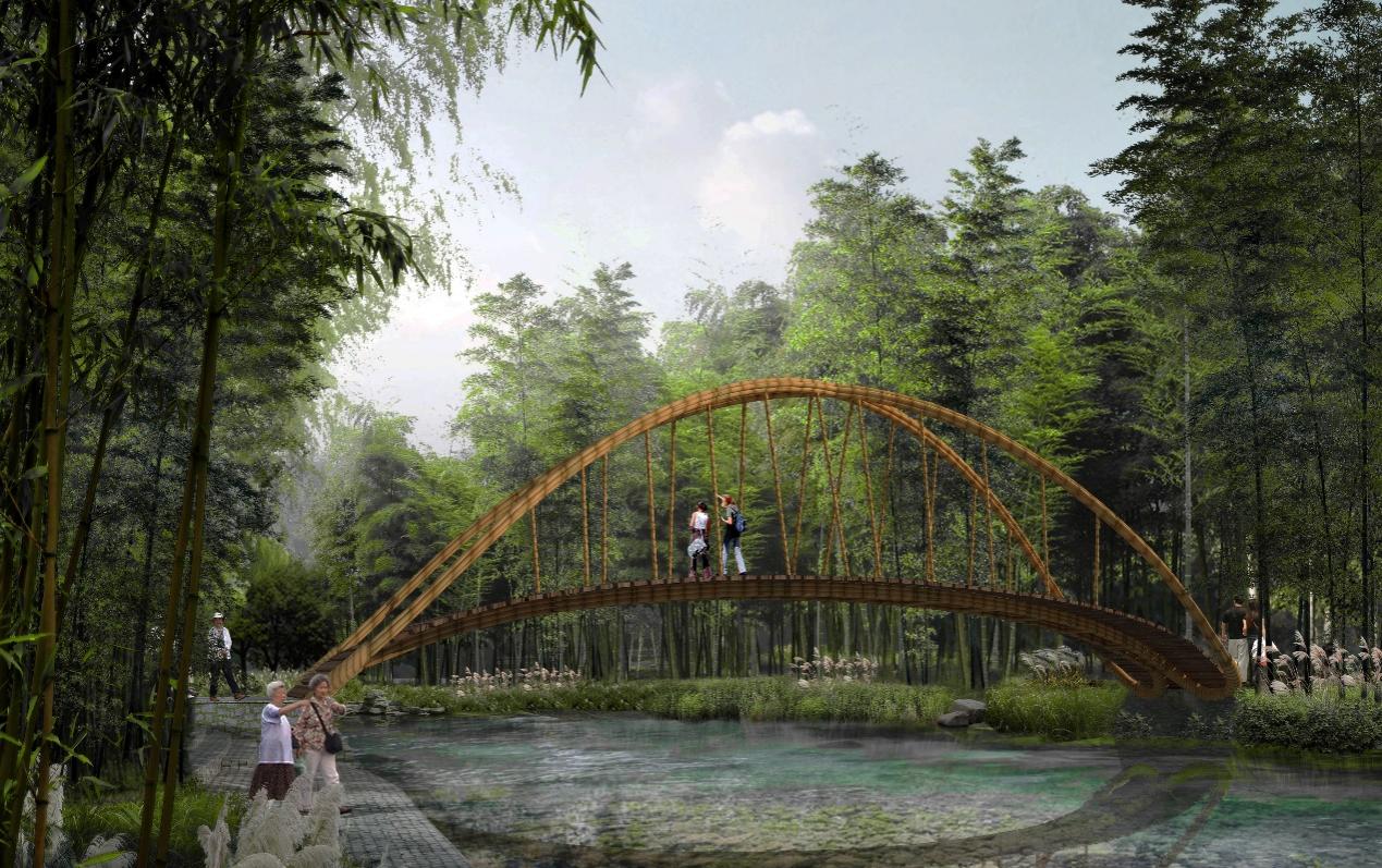 源自:静篁桥,“静”取义苏轼《减字木兰花》“神闲意定,万籁收声天地静。”“篁”取姚勉《闻莺》“风吹微湍入松篁,云幢叶盖相低昂。”整体传达出竹林宁静悠远的氛围,以竹之环保经济,用桥梁的力量助力乡村建设。