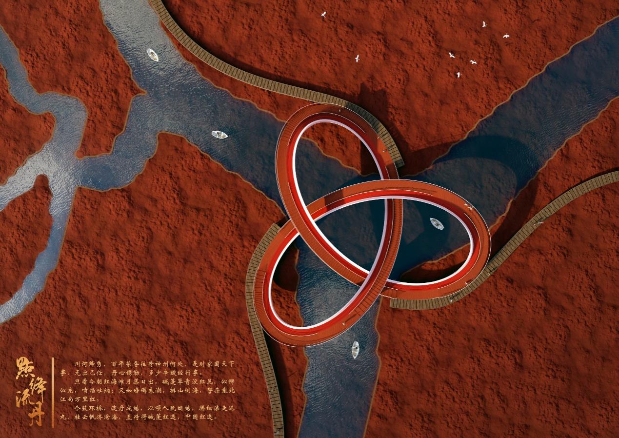 源自:点绛流丹,点绛取自江淹《咏美人春游》:“白雪凝琼貌,明珠点绛唇。”意为红海滩那一株株饱满欲滴的碱蓬草;流丹取自王勃《滕王阁序》:“层峦耸翠,上出重霄;飞阁流丹,下临无地。”意为盘旋舞动的桥梁。桥名结合了一望无际的红海滩碱蓬草景观和流畅的曲线桥型,情景交融,形成一幅生机盎然、雄奇浩瀚的自然画卷。