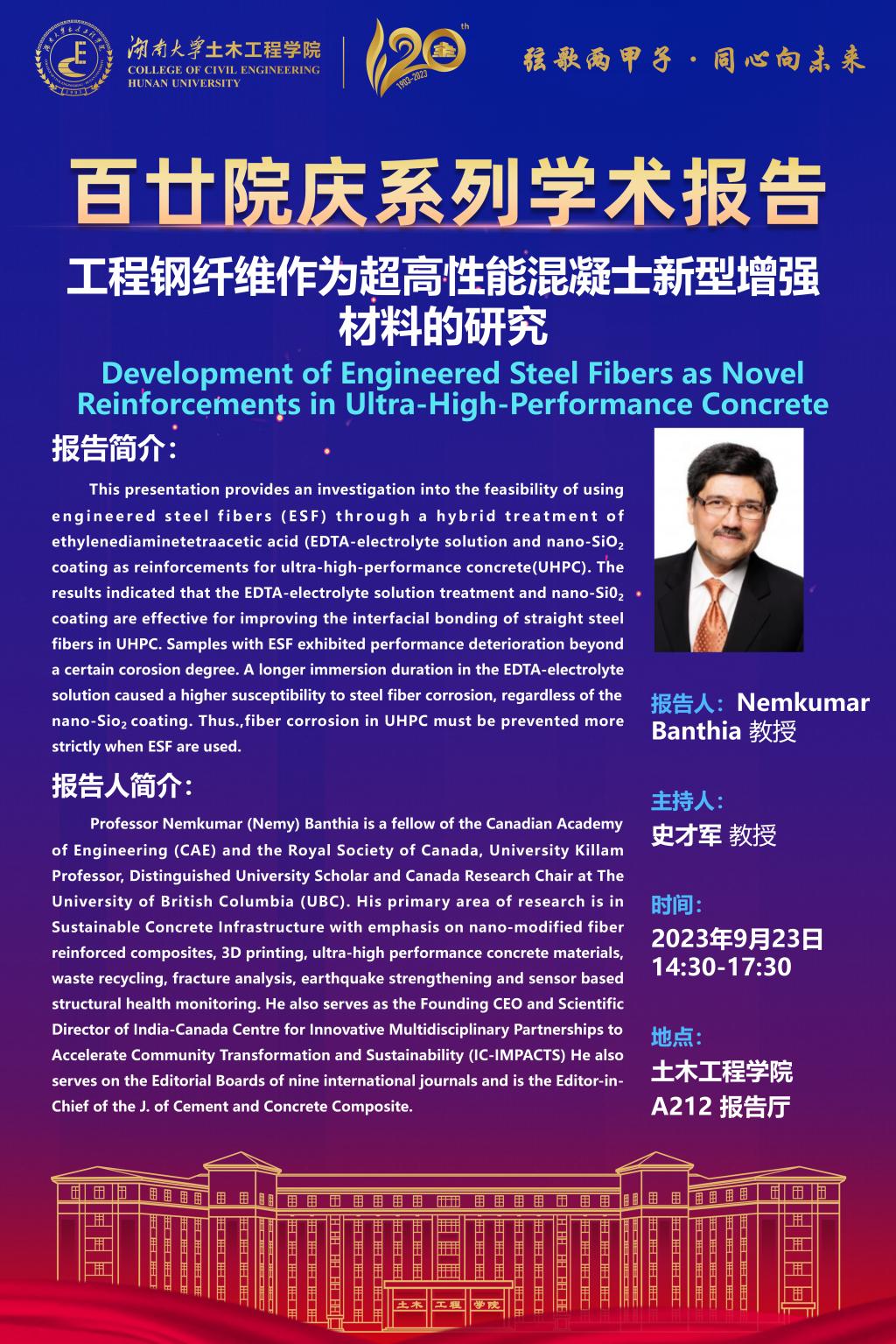 百廿院庆 学术活动|Nemkumar Banthia:Development of Engineered Steel Fibers as Novel Reinforcements in Ultra-High-Performance Concrete
