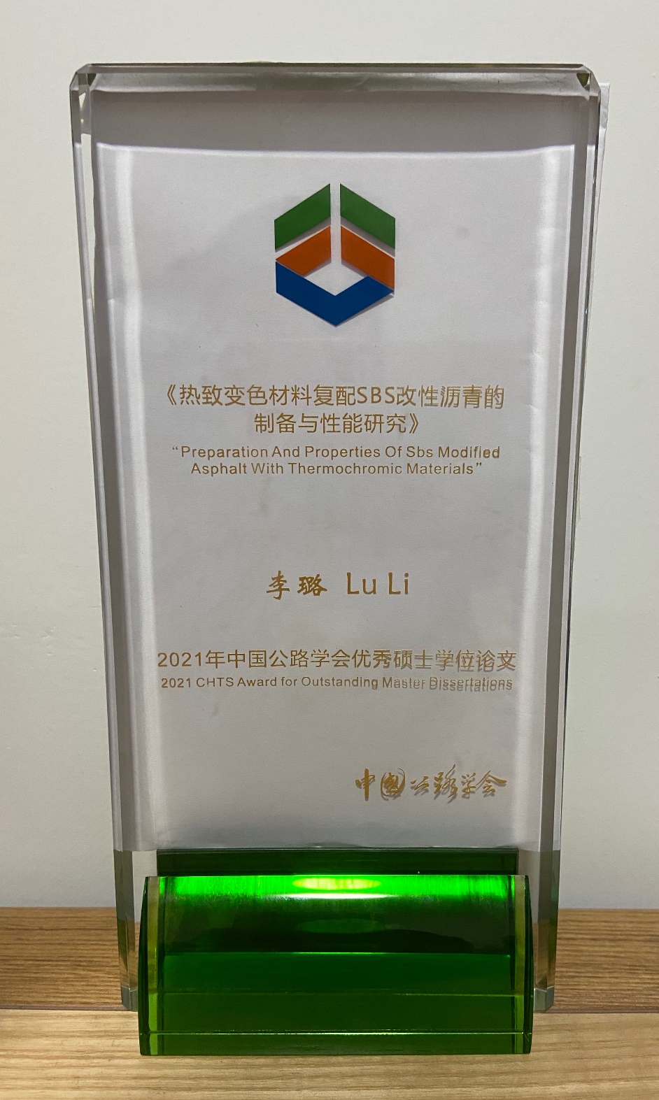2019届毕业生李璐的学位论文《热致变色材料复配SBS改性沥青的制备与性能研究》,荣获2021年度中国公路学会优秀硕士论文奖,其导师张恒龙副教授获得“中国公路学会优秀硕士论文指导教师”称号。本次共有来自同济大学、东南大学、哈尔滨工业大学等高校的102篇硕士论文参与评选,最终20篇硕士学位论文入选,并在2021年6月15日召开的世界交通运输工程技术论坛(WTC2021)上举行了颁奖典礼。