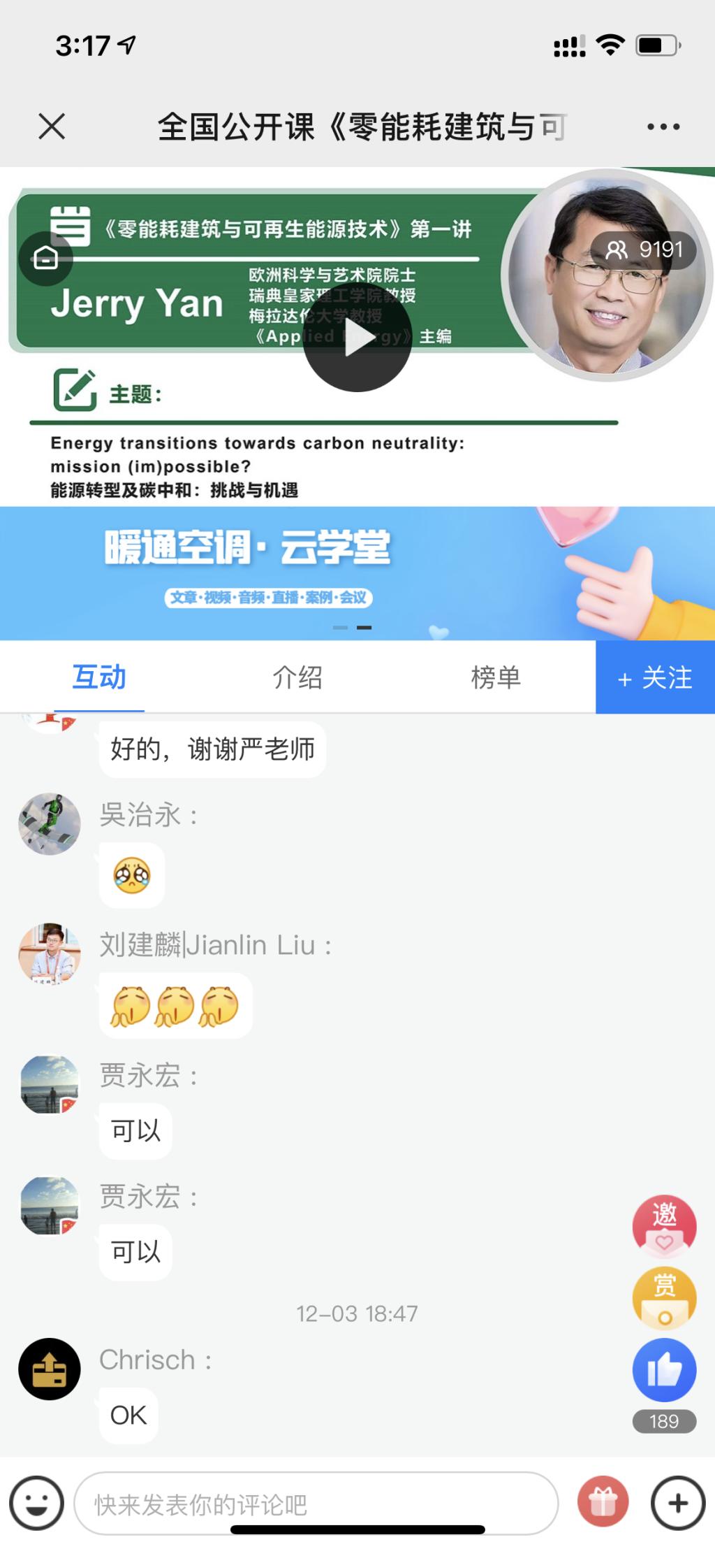 报告厅集中学习,同时还吸引了其他院校师生和企业高层管理者亲临现场参与。线上采取同步直播方式对外开放,将高品质教育资源分享给全社会。公开课直播期间,单场在线观众高达九千多人,累积在线观众超六万人次,极大的扩大了课程的受众群体。课堂气氛十分活跃,大量观众参与互动交流,加深了相关研究和技术的体会与理解,并碰撞出了新的火花,对大力发展零能耗建筑与可再生能源技术具有重要意义。课程效果超出预期,在业内收获了良好口碑,包括清华、浙大、香港理工、哈工大、同济等在内的高校学生纷纷对课程的组织形式和内容给予了高度评价。本课程的顺利举办是KISSAV