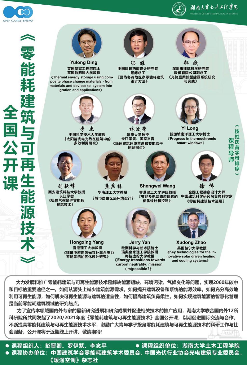 组织发起的《零能耗建筑与可再生能源技术》全国公开课于2021年1月19日圆满结束。本课程得到了中国建筑学会零能耗建筑学术委员会、中国光伏行业协会光电建筑专业委员会和《暖通空调》杂志社的大力支持,共邀请了分别来自瑞典、英国、新加坡、香港以及内地的十二所知名高校和科研院所的十三位院士、大师和知名专家授课。课程主要面向全国建筑环境与能源应用、建筑节能技术、可再生能源利用、储能等相关领域研究生、教学及科研人员,目的在于探索前沿,拓展视野,深化国际交流合作,激发广大学术和教学科研人员对零能耗建筑与可再生能源技术的研究兴趣。