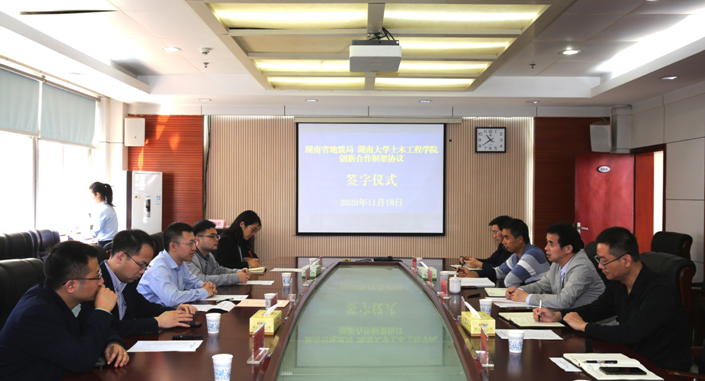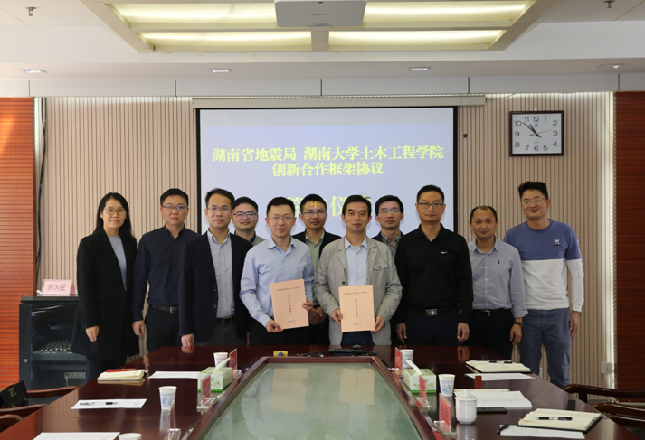 与湖南省地震局创新合作框架协议签署仪式在湖南省地震局举行。省地震局党组书记、局长燕为民主持仪式并致辞,院长邓露出席仪式并讲话。省地震局党组成员、局长助理王春华、土木学院副院长彭晋卿等出席活动。