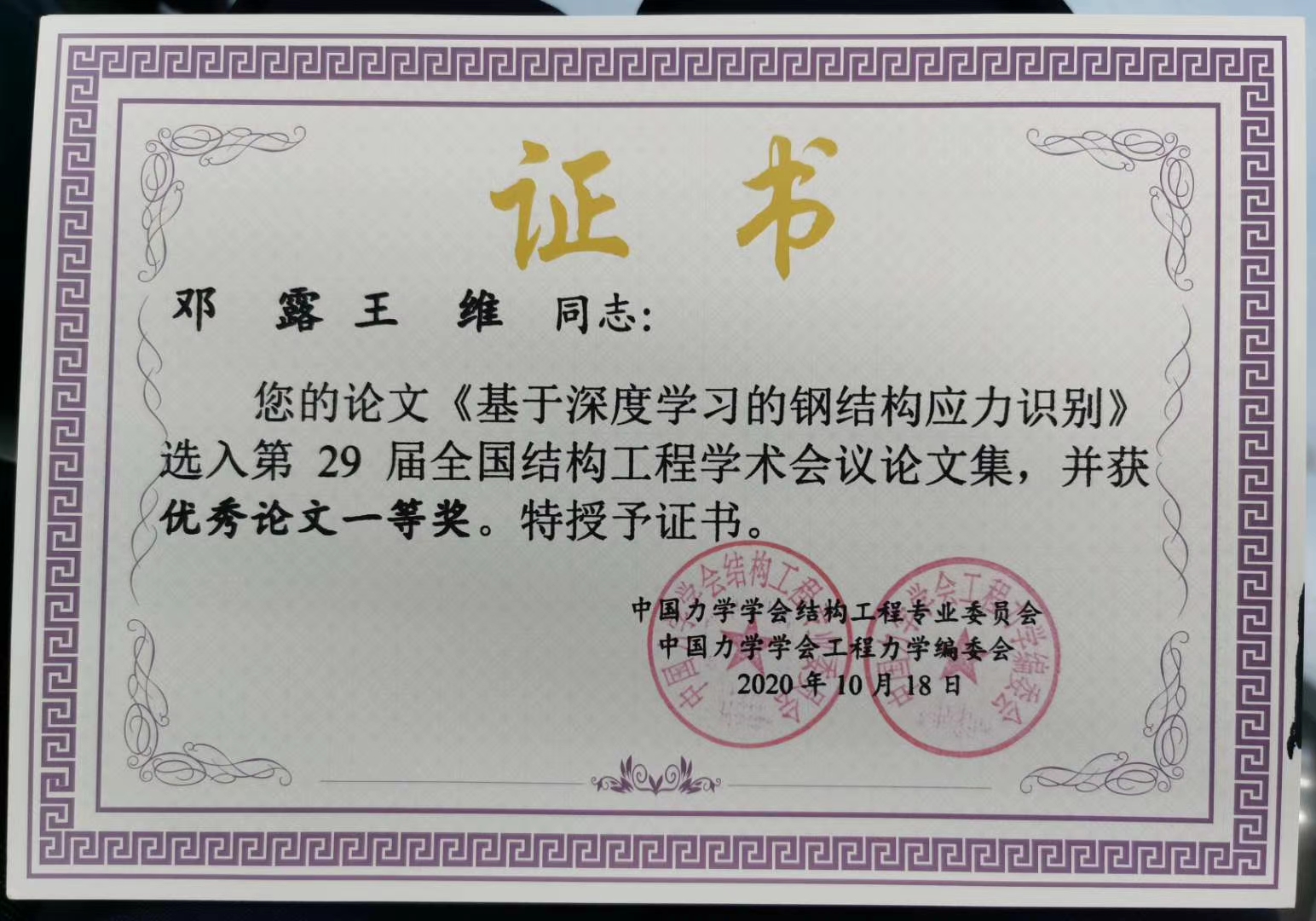 邓露教授、王维助理教授合著的论文《基于深度学习的钢结构应力识别》荣获优秀论文一等奖。