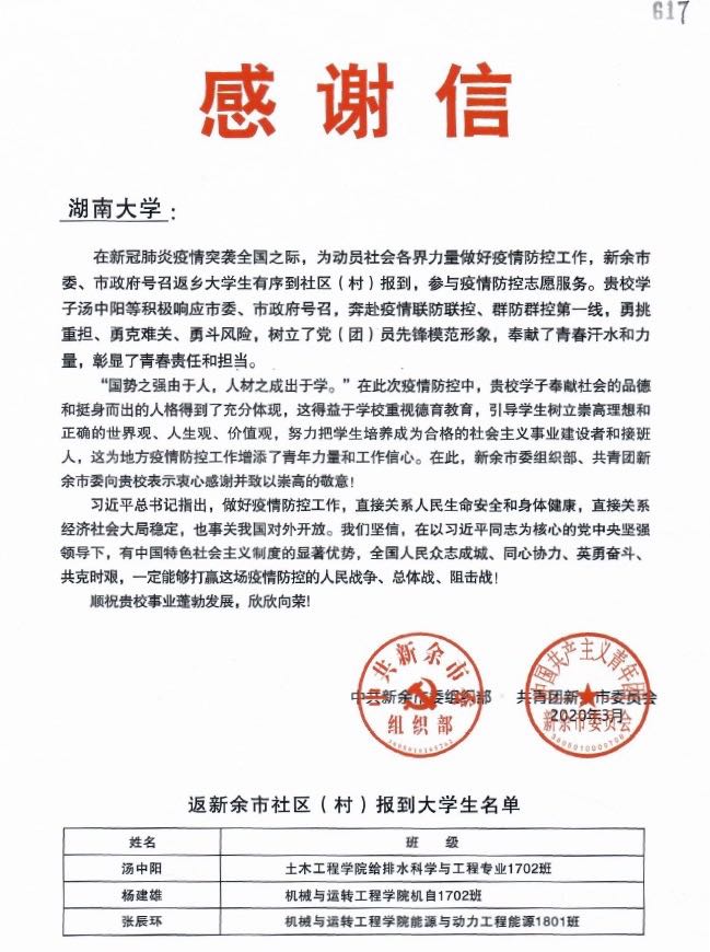 2017级给排水科学与工程专业1702班汤中阳同学积极参与当地疫情防控志愿服务、彰显青年责任担当表示感谢。
