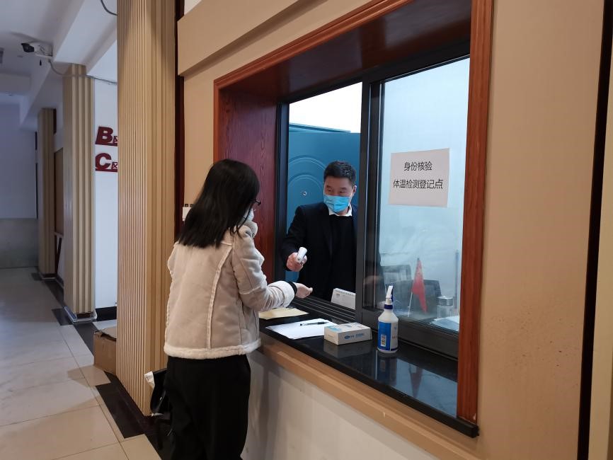 学院办公楼身份核验和体温检测登记点。