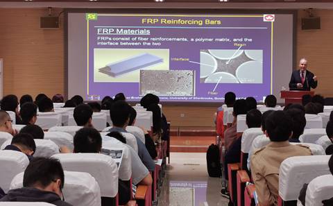 本次课程Brahim Benmokrane教授就FRP配筋的力学性能、测试方法与标准、实验室测试与现场应用、FRP配筋的结构设计方法与步骤、FRP配筋混凝土构件的弯曲/剪切/压缩设计、FRP配筋混凝土的服役年限与耐久性设计等方面进行了精彩的讲述,并和学员们进行了全面的交流。
