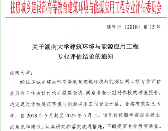2018年6月8日,住房和城乡建设部高等教育建筑环境与能源应用工程专业评估委员会印发了《关于湖南大学建筑环境与能源应用工程专业评估结论的通知》(建环评(2018)第15号),通过了KISSAV