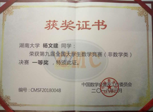 给排水科学与工程专业15级杨文建同学荣获本次大赛非数学专业组湖南赛区唯一的一等奖。
