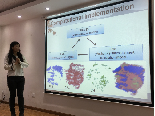德州农工大学李晓丹博士以“水化反应中水泥颗粒的溶解对混凝土徐变的影响”为题,报告了建立水化模型对水泥的早期水化反应进行模拟,应用有限元分析来预测水泥的早期徐变和蠕变。研究发现,水泥的早期水化溶解可以是引发水泥徐变的一个重要机理。