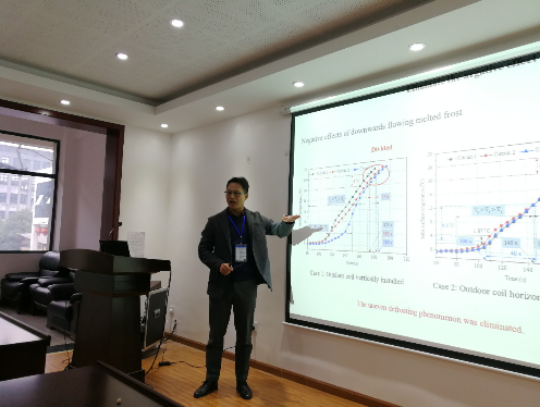 宋孟杰博士基于空气源热泵室外多环路换热器变均匀度结除霜的物理特性系统阐述了传热传质流动耦合作用的影响机理,同时汇报了平面霜层结构精测及其重构领域的前沿进展。
