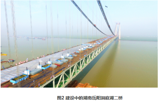 岳阳洞庭湖二桥是杭瑞高速临湘至岳阳段的控制性工程,全长2.39km,东起岳阳市七里山,横跨洞庭湖,西至君山。主桥采用主跨1480m的双塔双跨钢桁梁悬索桥,建成后将是世界第二、国内第一大跨径的钢桁梁悬索桥(图2)。