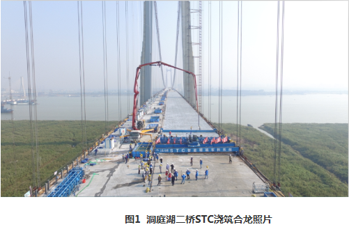 11月2日,岳阳洞庭湖二桥超高韧性混凝土(Super Toughness Concrete,STC)完成最后一段浇筑(图1),至此,大桥6.5万平米的STC铺筑施工全部完成。STC轻型组合桥面是我校KISSAV