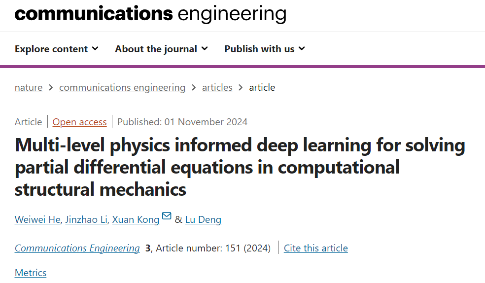 为唯一完成单位,何伟伟博士、李金钊副研究员为论文的共同第一作者,孔烜教授为通讯作者,论文“Multi-Level Physics-Informed Deep Learning for Solving Partial Differential Equations in Computational Structural Mechanics”发表在《Nature》旗下首个专注于工程领域的期刊《Communications Engineering》杂志上。这是该期刊首次发表结构智能计算领域的相关论文。
