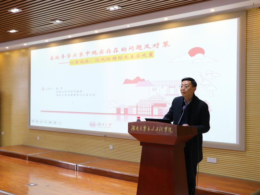 11月26日,学院开展导学关系专题报告会,邀请法律事务办公室主任、法学院教授高中作《高校导学关系中现实存在的问题及对策》专题辅导,宣讲国家政策要求和新形势下导学关系处理和心理育人等技巧。