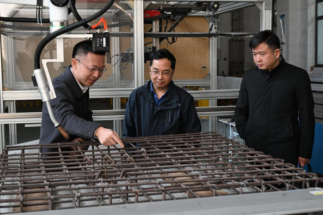 调研组考察了学院智能建造实验室。实验室现场演示了钢筋绑扎机器人、焊接机器人及轨枕检测机器人等智能化设备的运行场景。调研组对实验室在智能建造技术研发、产学研融合方面的创新实践给予高度评价,并充分肯定了其在实际工程中的应用潜力。