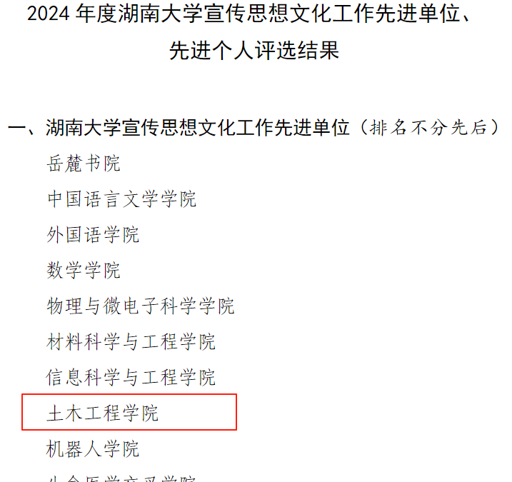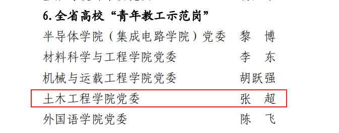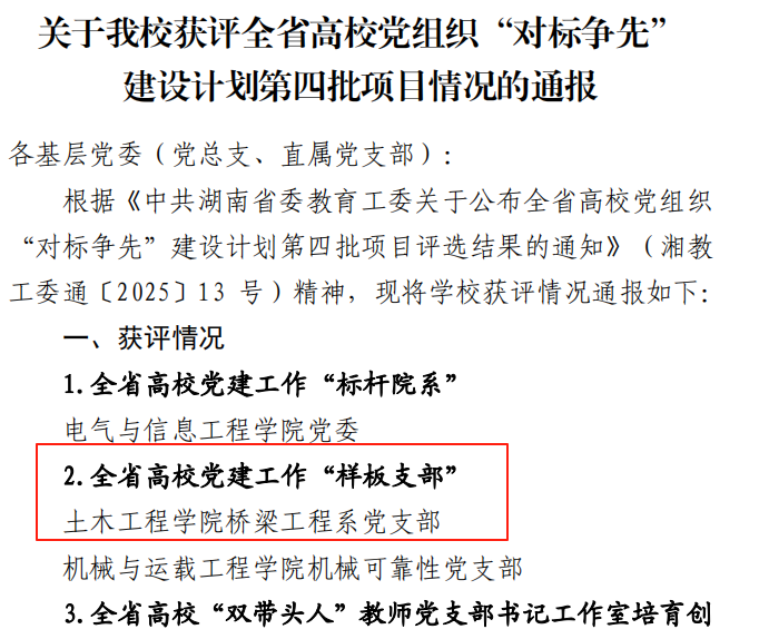 党建工作方面,中共湖南省委教育工委公布了全省高校党组织“对标争先”建设计划第四批项目评选结果,学院桥梁工程系党支部获评全省高校党建工作“样板支部”,学院张超教授获评全省高校“青年教工示范岗”称号。