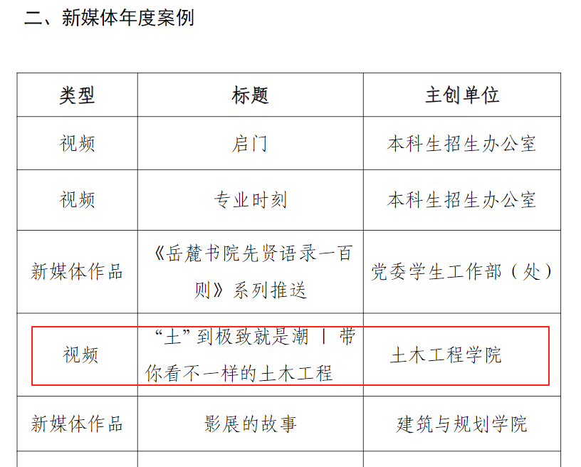 ”获评十佳校园新媒体,张家辉同志获评“宣传思想文化工作先进个人”,学院原创视频作品《“桥”见湖湘》获得“优秀新闻作品一等奖”,作品《“土”到极致就是潮》荣获“新媒体年度案例奖”,这些作品生动展现了学院在科技创新和文化传承方面的实践成果。