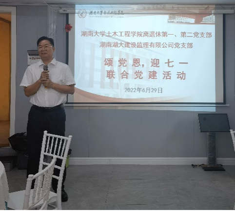 6月29日上午,雨后天晴,空气清新,土木学院离退休第一、第二支部与湖南湖大建设监理有限公司支部党员进行联合支部活动,开展颂党恩,迎七一党建活动。参加活动的有土木学院党委副书记周石庆,湖南湖大建设监理有限公司董事长姜早龙、总经理金波。联合党建活动由土木学院离退休第一支部书记邓铁军主持。